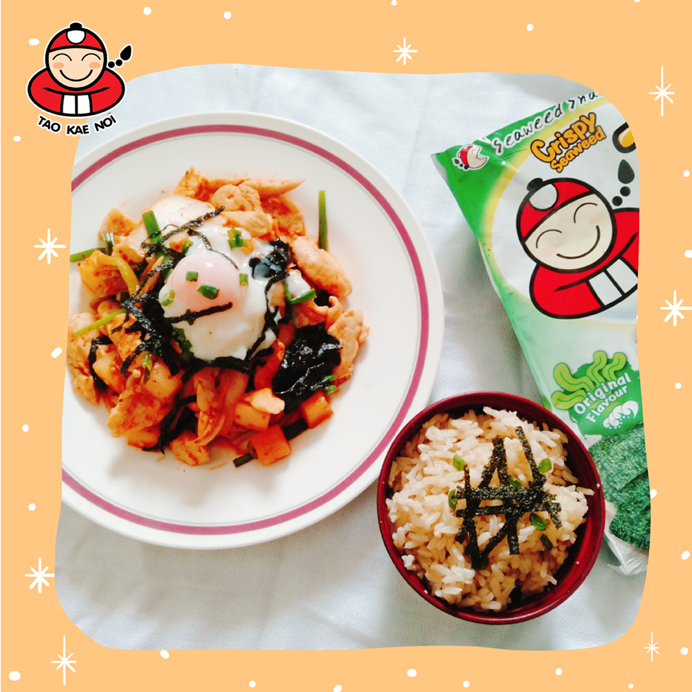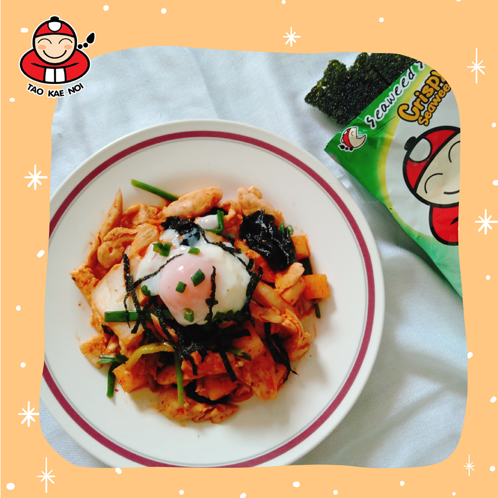 2. Add the chopped kimchi, stir-fry to mix them well together.