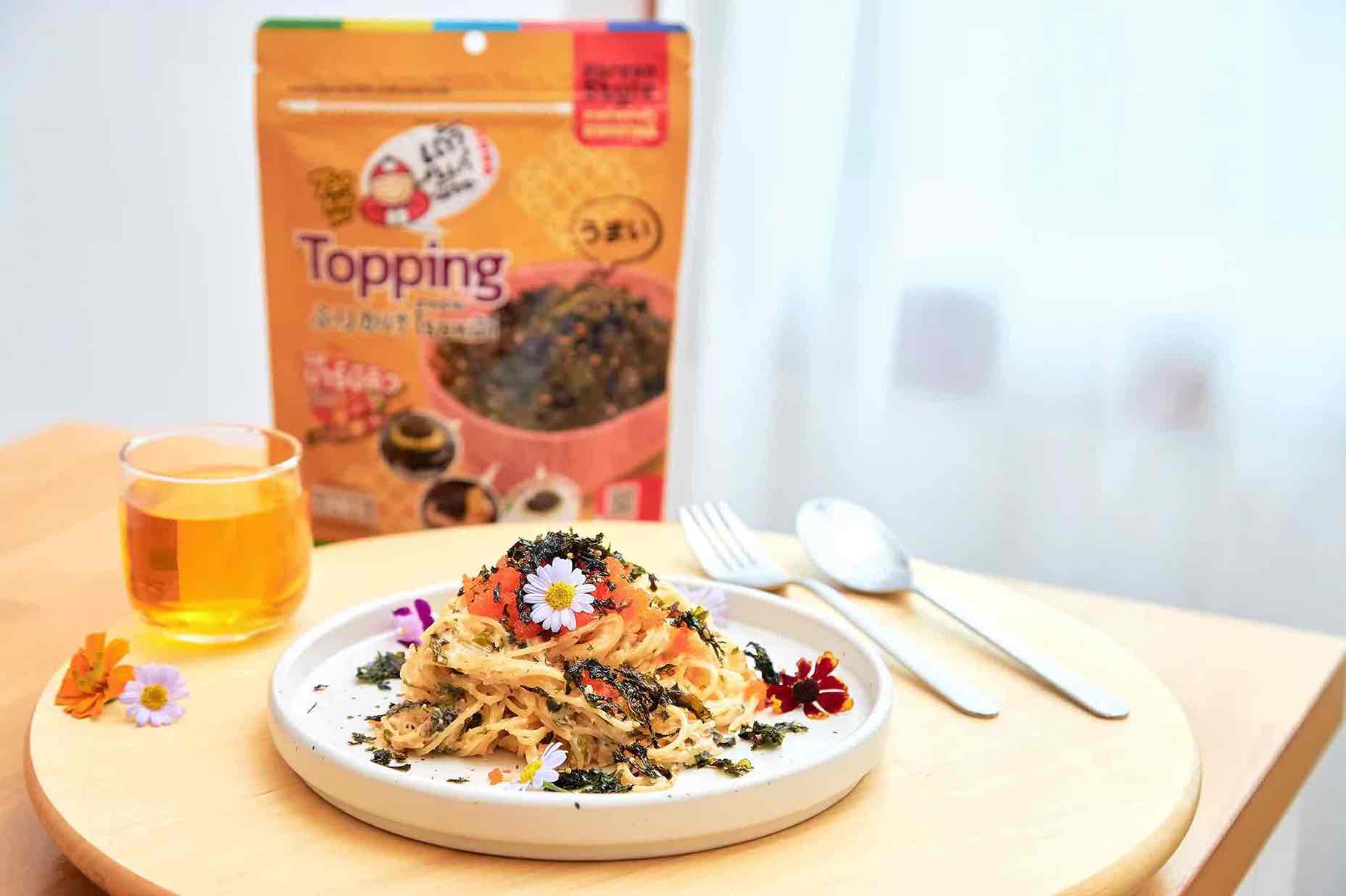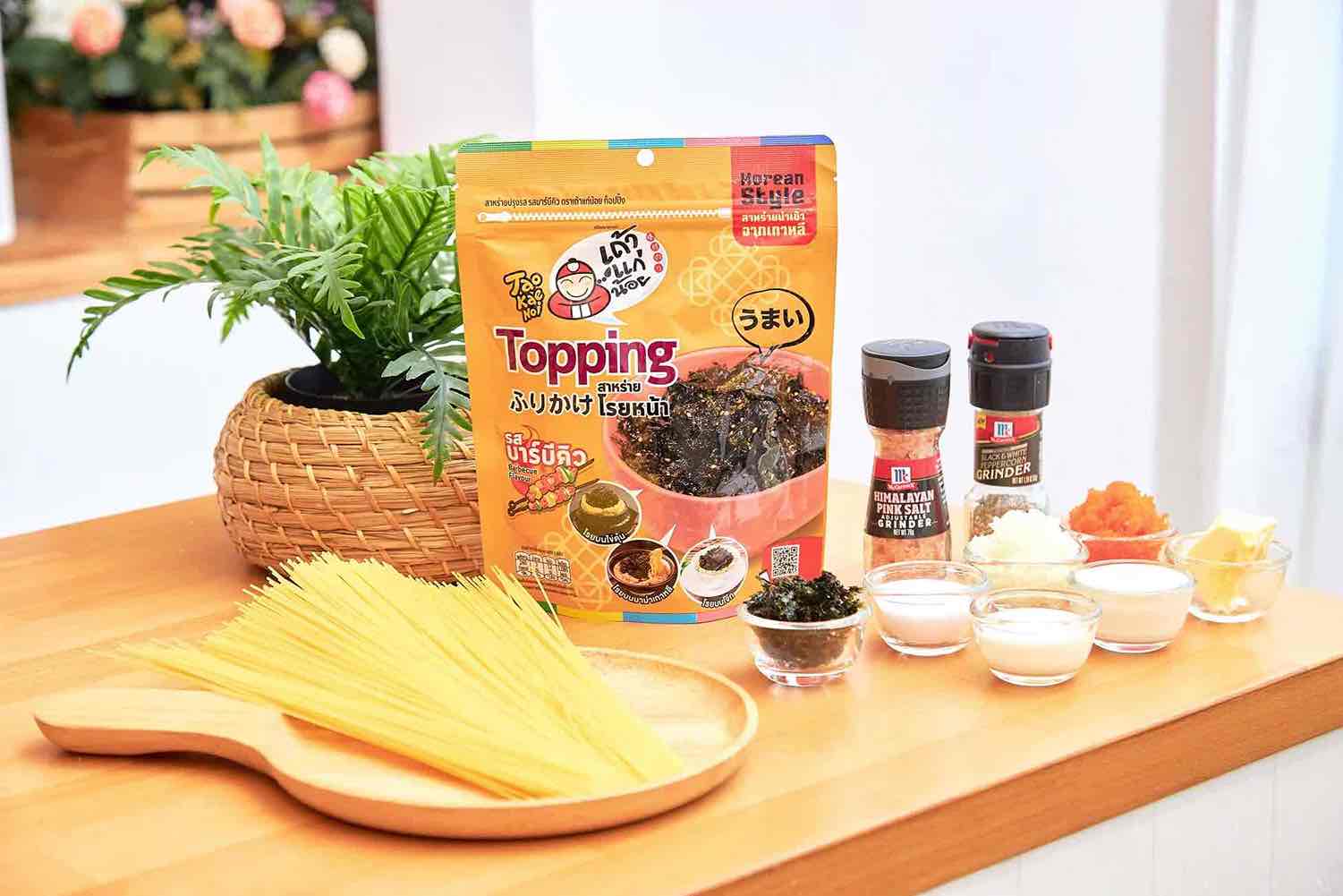 5.ตักสปาเก็ตตี้ใส่จาน พร้อมโรยไข่กุ้ง และโรยสาหร่ายเถ้าแก่น้อยรส BBQ เพิ่มรสเผ็ดท็อปด้านบน เป็นอันเสร็จ ความอร่อยขึ้นโต๊ะพร้อมเสริ์ฟ! ค่ะเชฟ