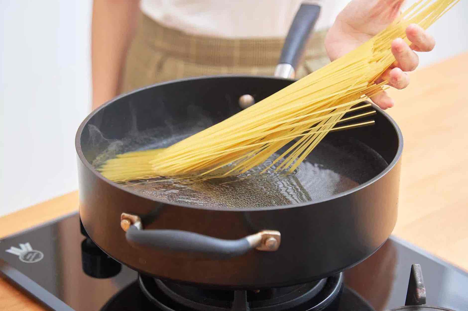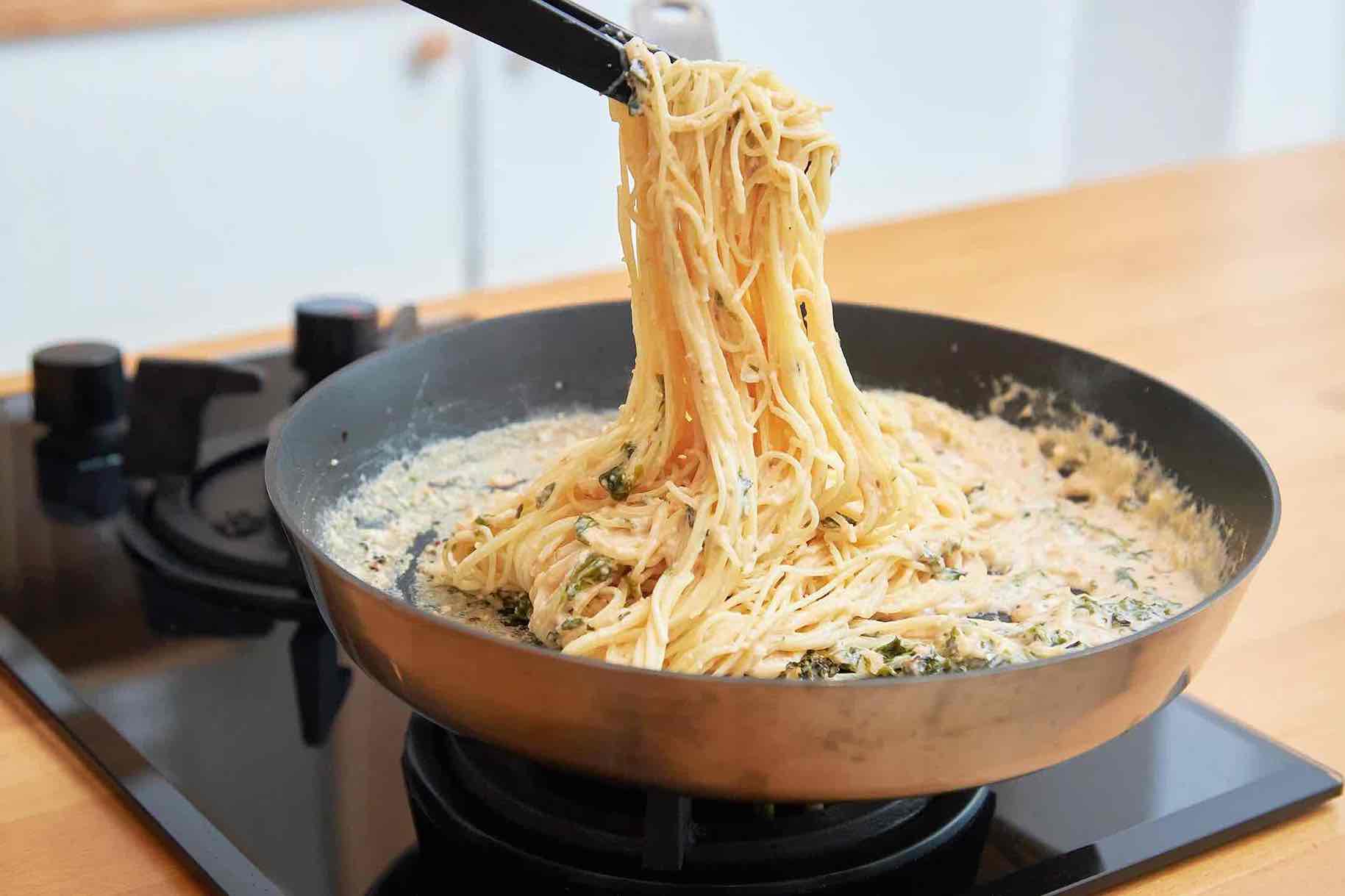 4.ใส่เส้นสปาเก็ตตี้แองเจิ้ลแอร์ลงไป ผัดจนครีมเคลือบเส้น แล้วปิดไฟทันที ทริคสำคัญ!! ห้ามผัดนาน เส้นจะไม่ Al dente และนิ่มเกินไป