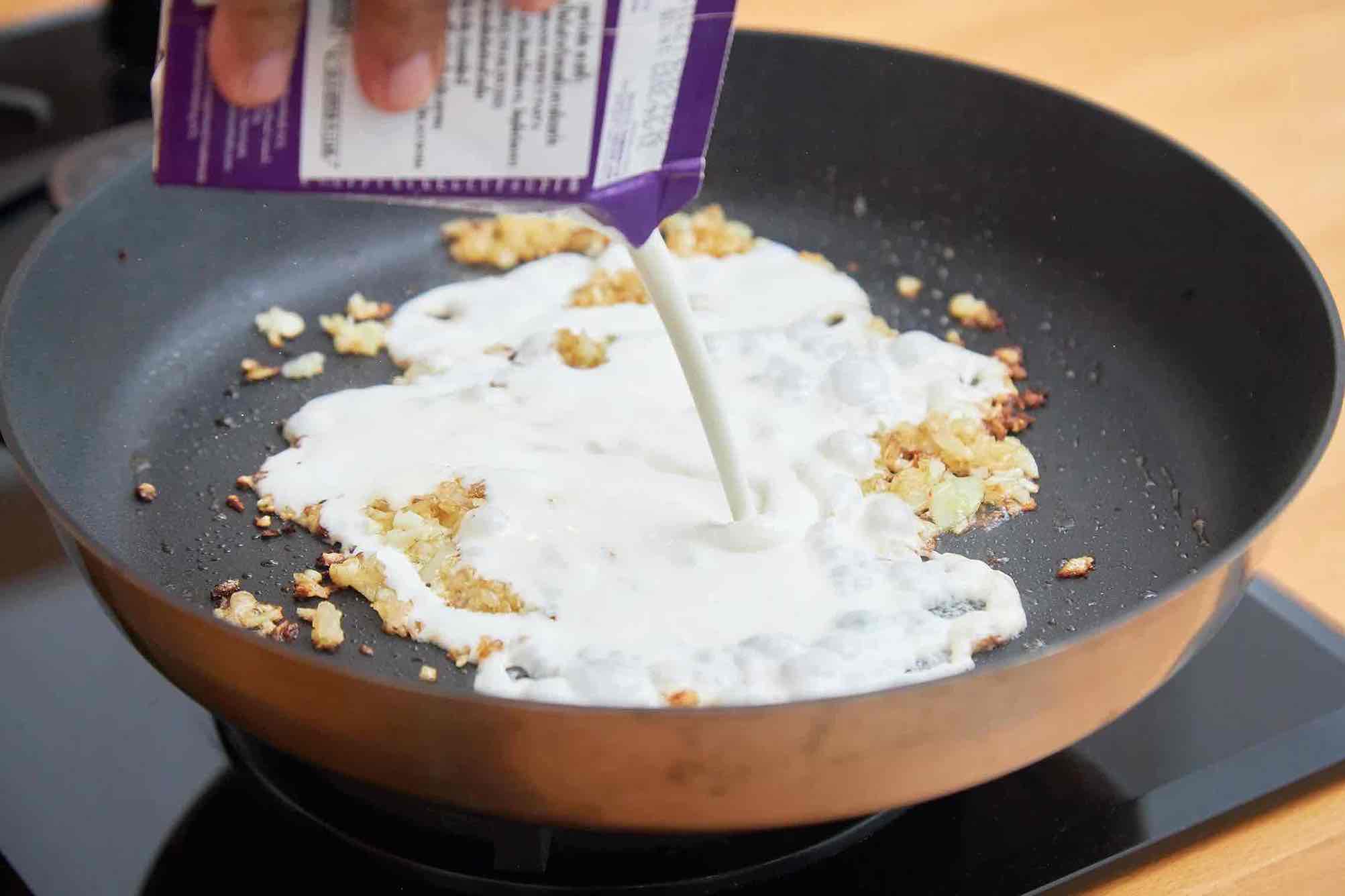 2.ตั้งกระทะบนเตาใช้ไฟกลาง ใส่เนย และหอมใหญ่ผัดจนสุก ตามด้วย วิปปิ้งครีม ผัดต่อจนครีมงวดลง