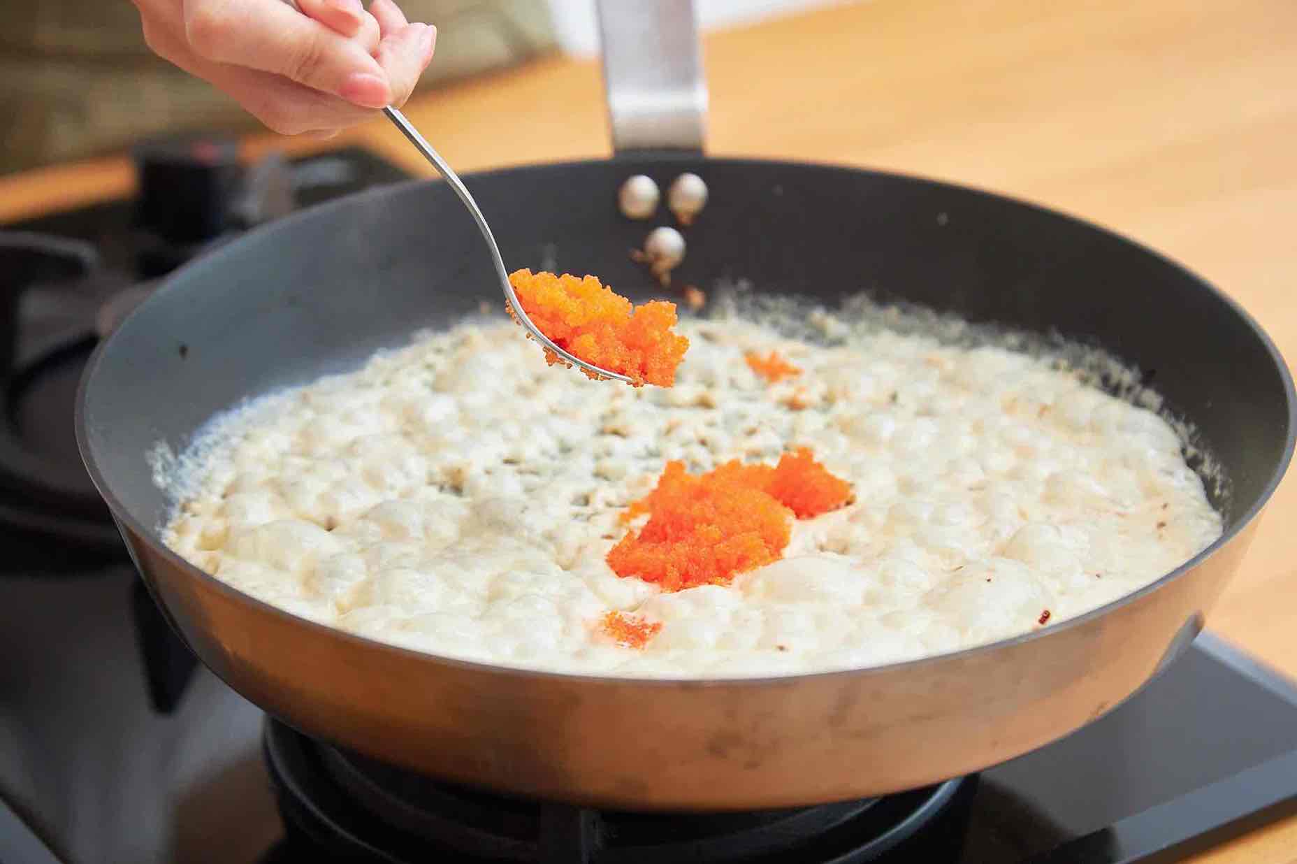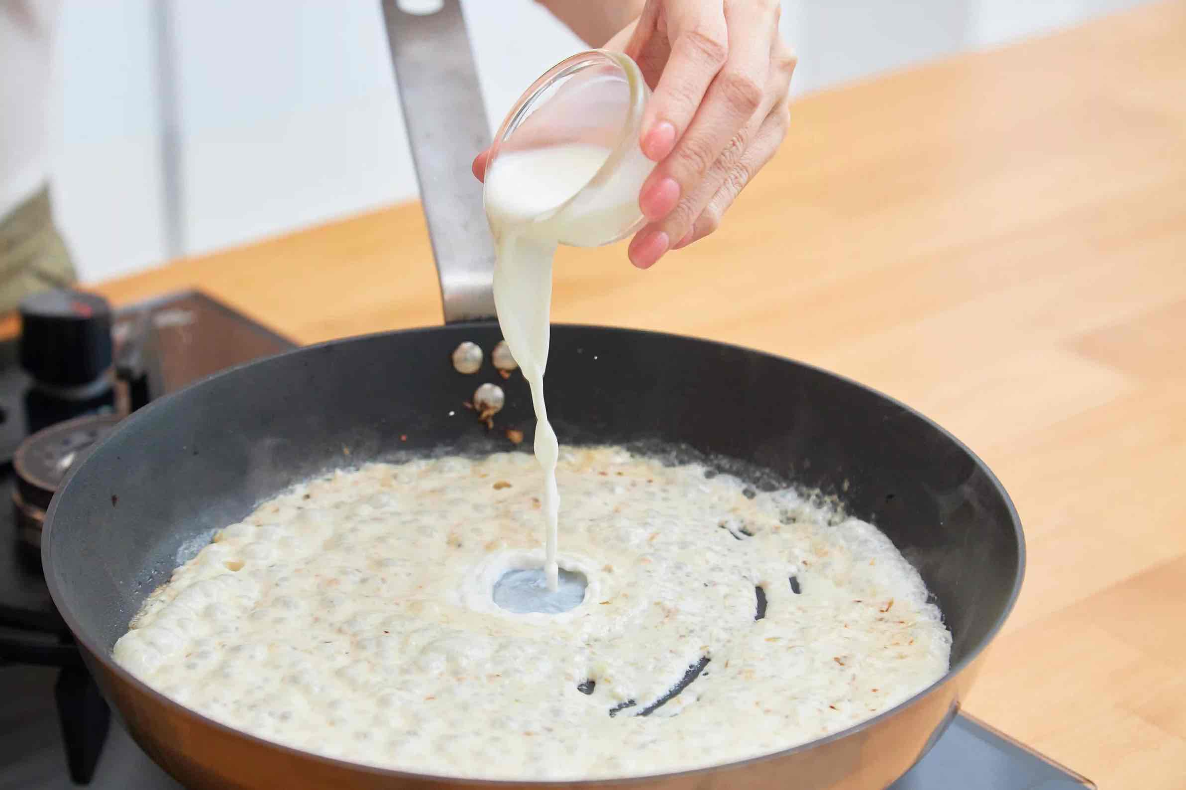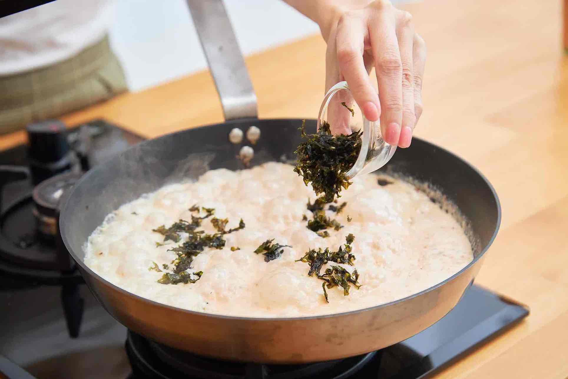 3.หรี่ไฟแล้วใช้ไฟอ่อน ใส่นม ไข่กุ้ง และสาหร่าย คนให้เข้ากัน
