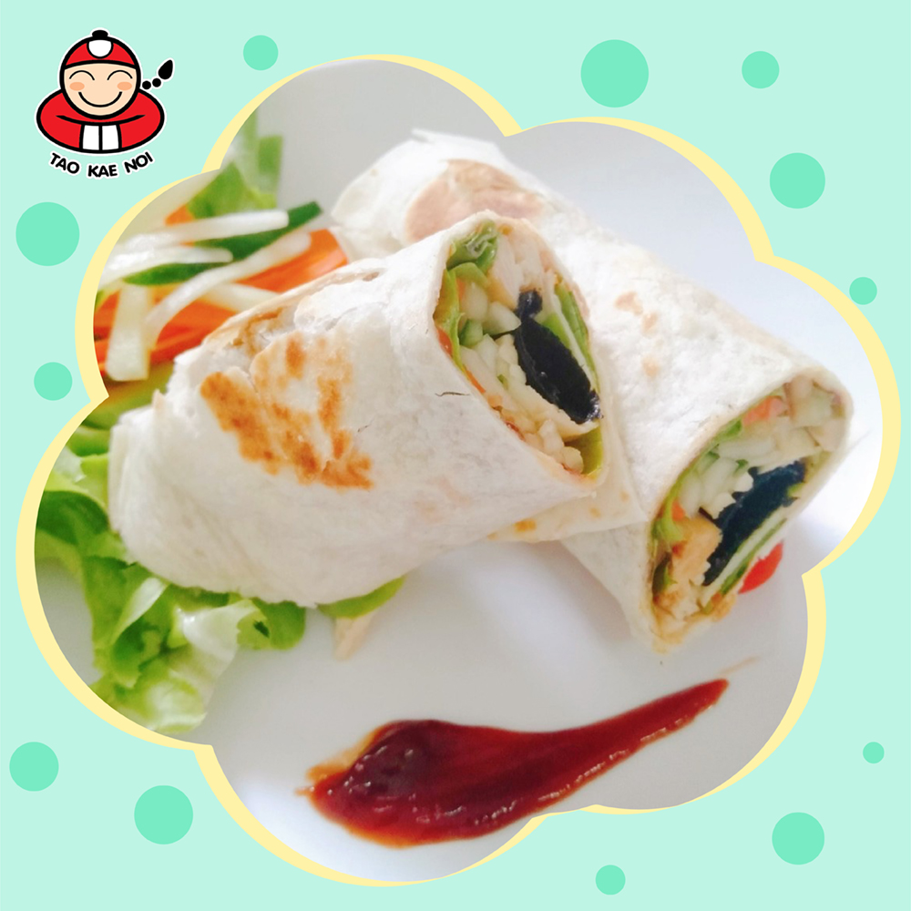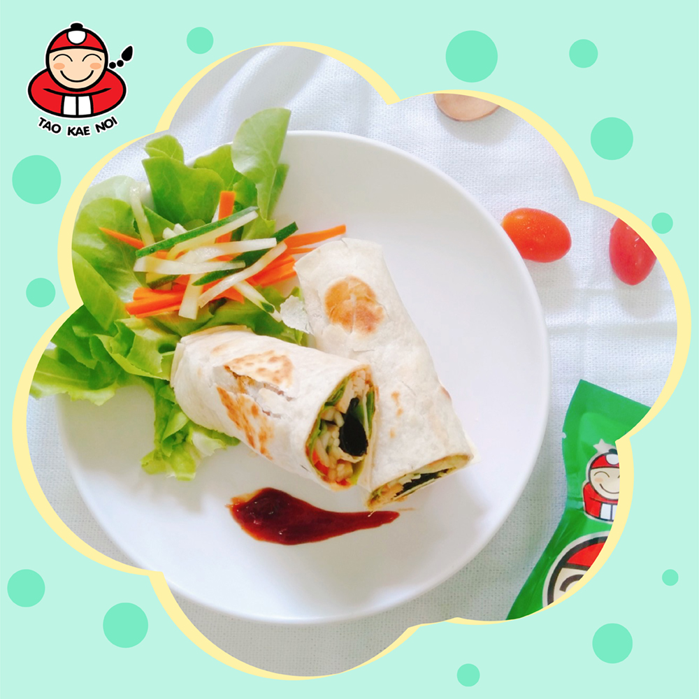 4. ทาซอสมะเขือเทศลงบนแป้งตอติญ่าให้ทั่วแผ่น จากนั้นวางผักกรีนโอ๊ค ตามด้วยแครอท แตงกวา และสาหร่ายม้วนรสคลาสสิคเถ้าแก่น้อยลงไปบนแป้ง
