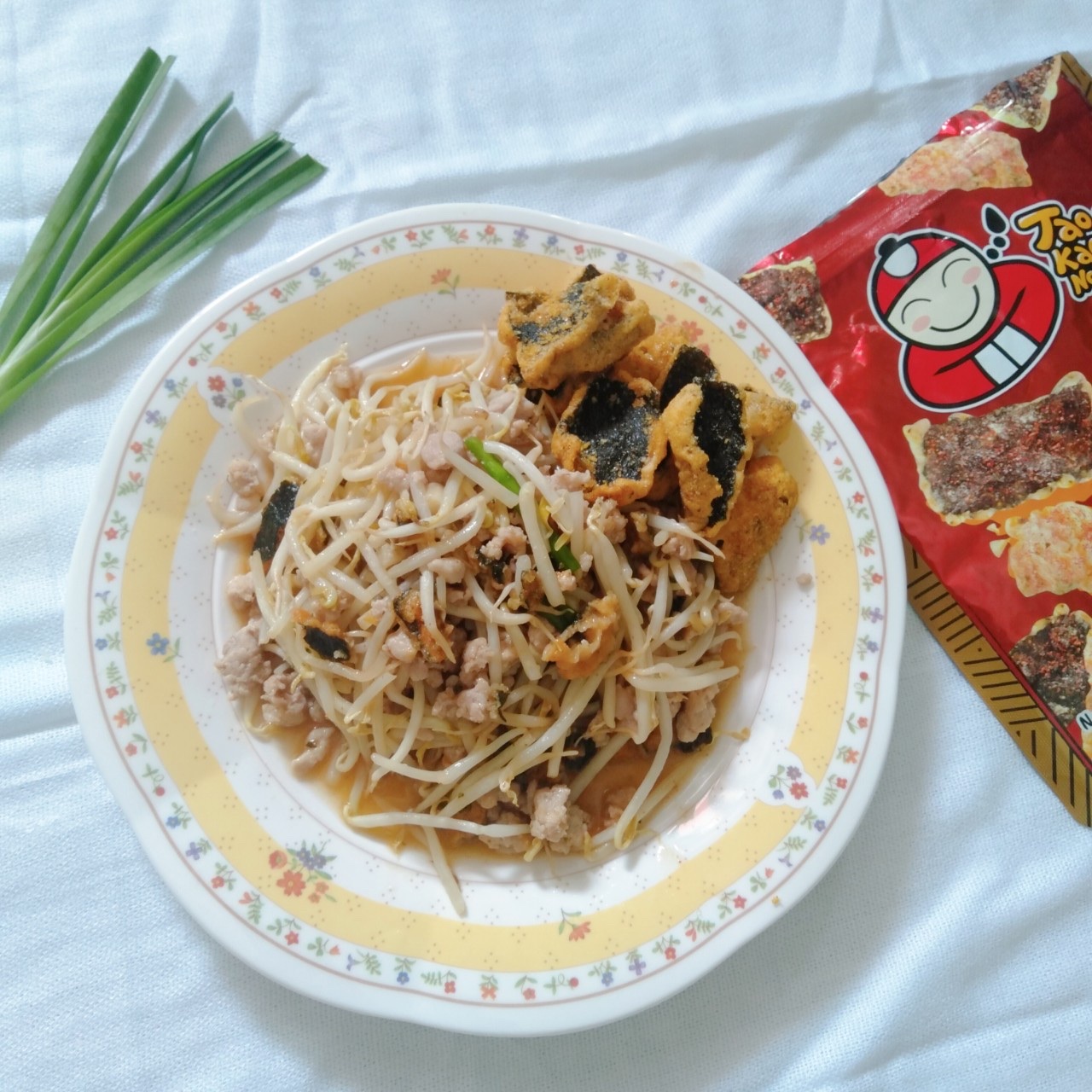 4. ใส่ถั่วงอกลงไป จากนั้นปรุงรสด้วยซอสหอยนางรม และซีอิ๊วขาว แล้วผัดในกระทะเล็กน้อยพอให้ถั่วงอกเริ่มนิ่ม