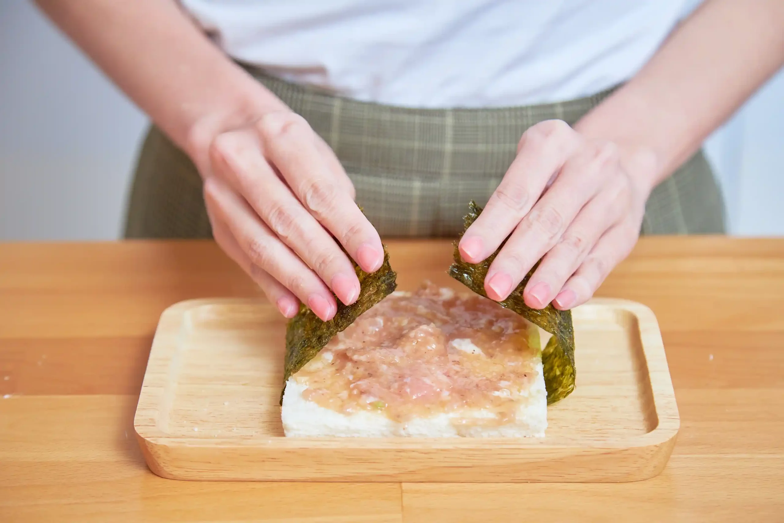 2. นำขนมปังมาทาด้วยกุ้งที่ผสมไว้จนทั่วแผ่น แล้วเอาสาหร่าย Long sheet รสบาร์บีคิว พันคาดกับตัวขนมปังอีกที