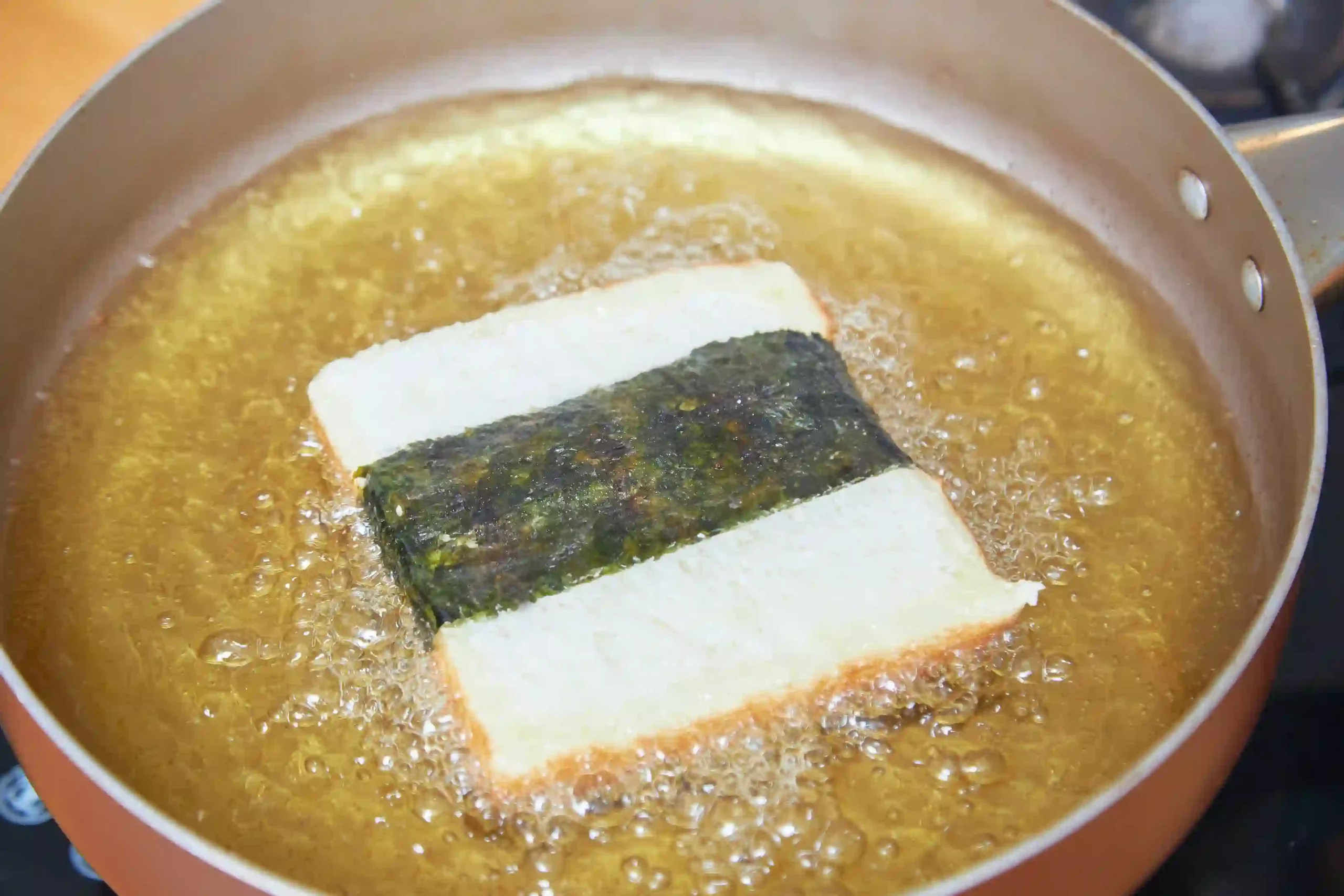 3. เปิดเตาตั้งน้ำมันที่ไฟกลาง รอจนน้ำมันเริ่มเดือด ใส่ขนมปังที่ทาหน้ากุ้งลงไปในกระทะ ทอดจนเหลืองกลางๆ ไม่เข้มมากแล้วตักขึ้นสะเด็ดน้ำมัน ความร้อนจาก
