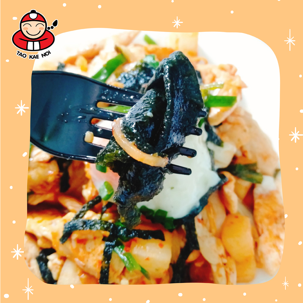 4. ตัดสาหร่ายเถ้าแก่น้อยเป็นชิ้นๆ เล็ก จากนั้นเอาลงไปผัดในกระทะประมาณ 3-4 ครั้ง