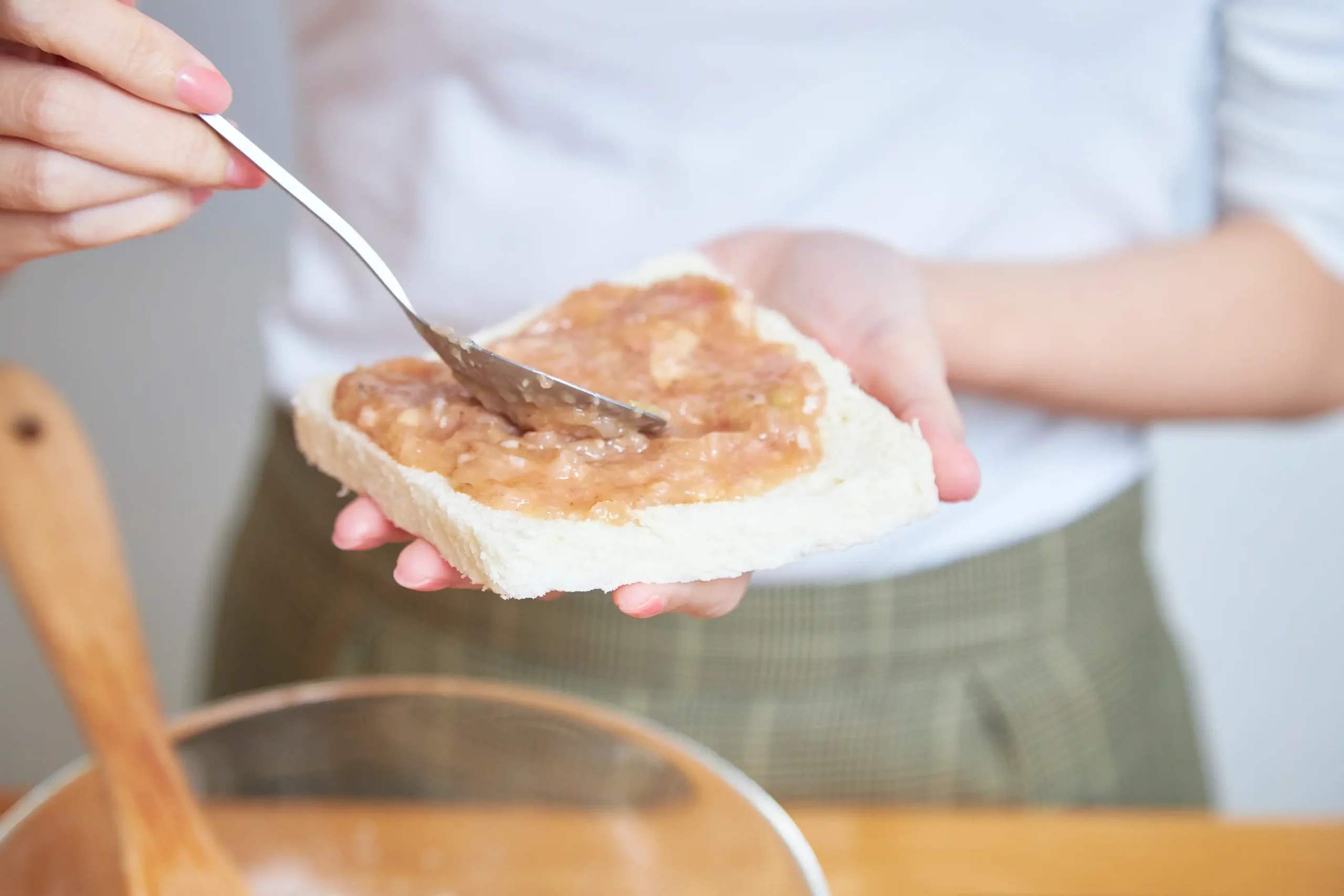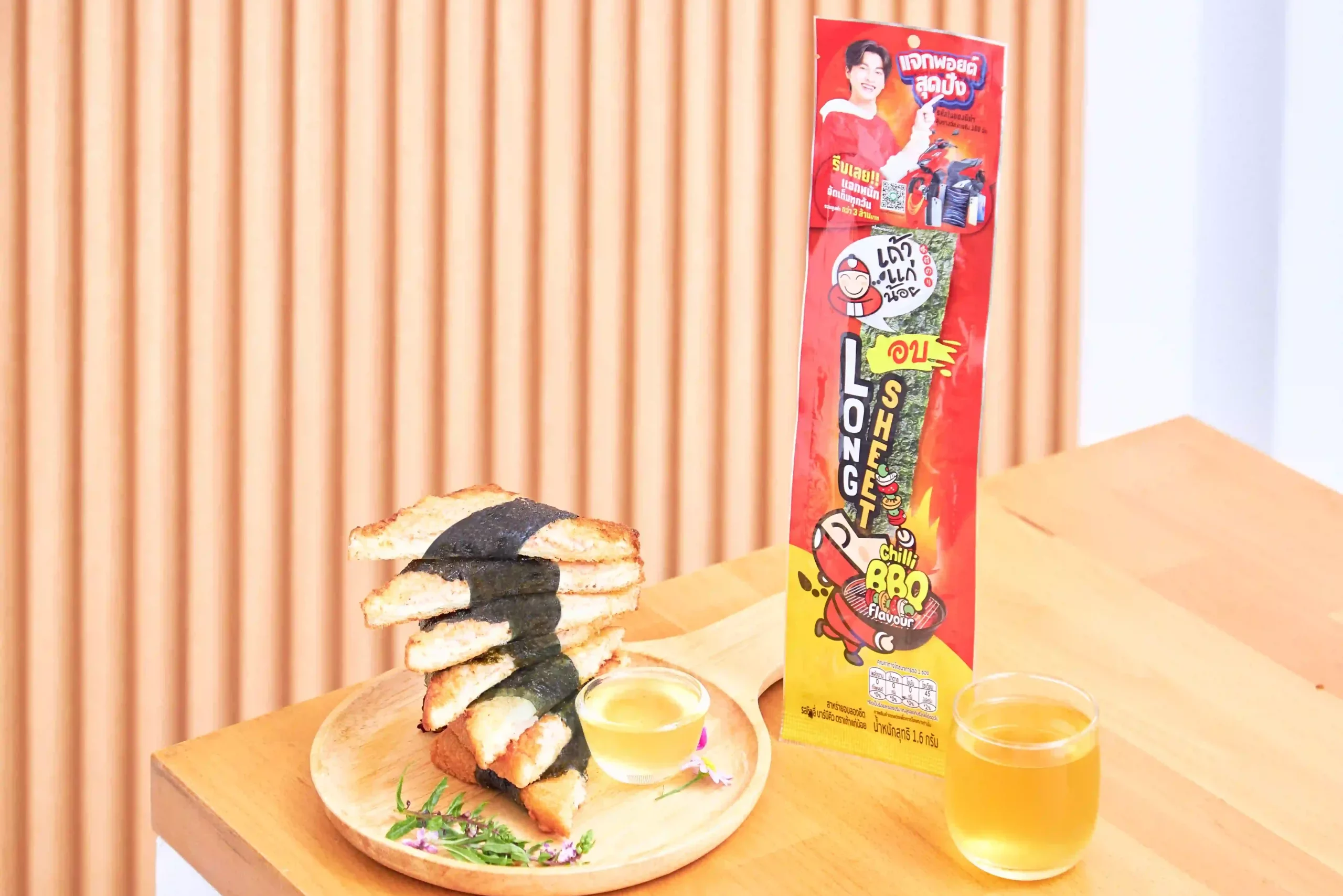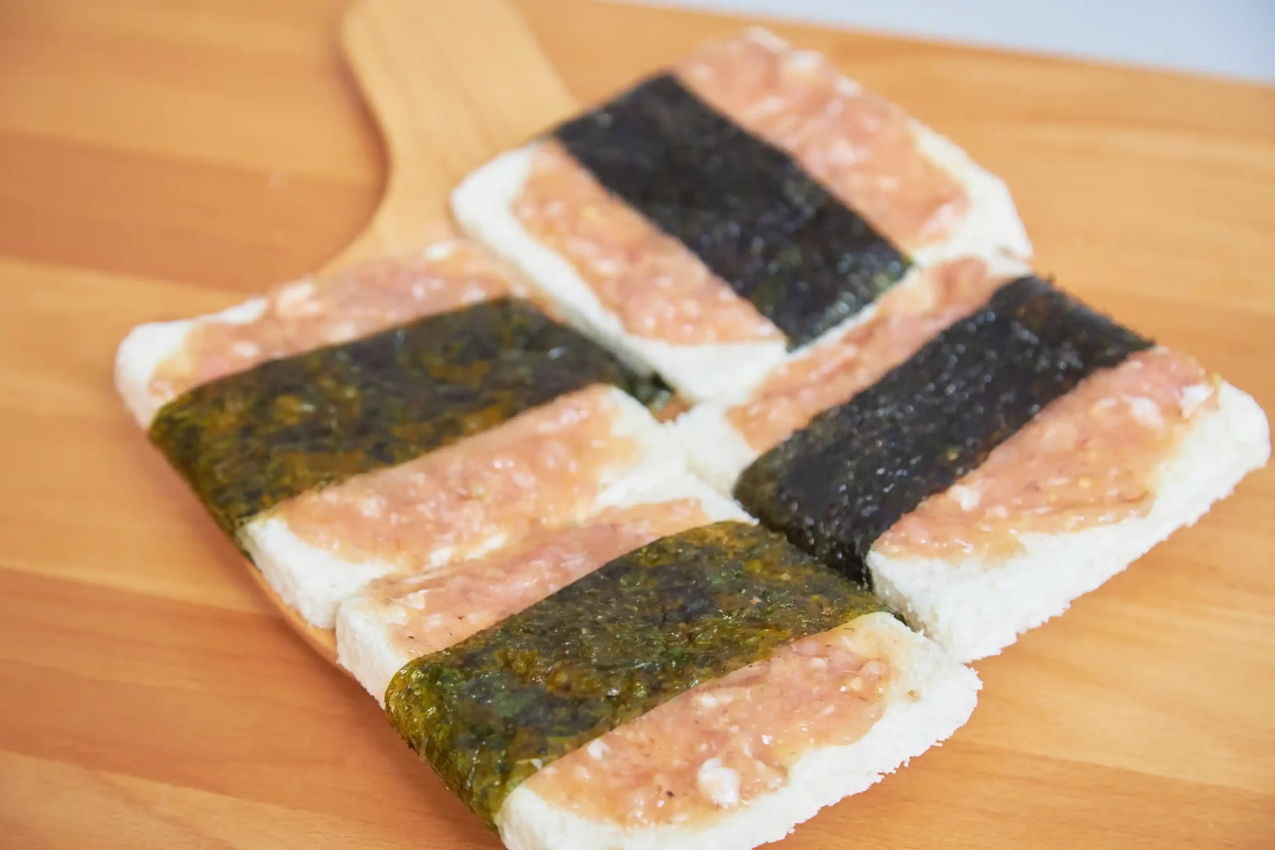 2. นำขนมปังมาทาด้วยกุ้งที่ผสมไว้จนทั่วแผ่น แล้วเอาสาหร่าย Long sheet รสบาร์บีคิว พันคาดกับตัวขนมปังอีกที